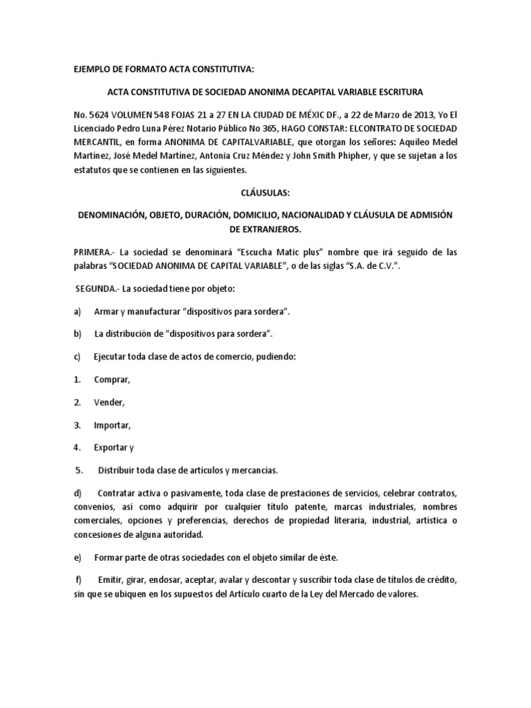 Doc Modelo De Acta Constitutiva De Una Compania Anonima Ciudadano