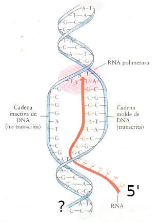Por ejemplo si hay una g en la plantilla de adn la arn polimerasa agregará una c a la nueva cadena de arn en crecimiento.
