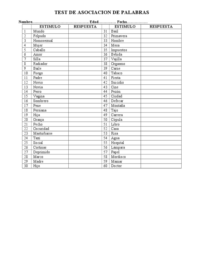 A un grupo de personas los individuos se les propone de uno en uno alguna palabra estímulo consecuentemente se les pide que digan o escriban las primeras palabras que libremente se les ocurren.