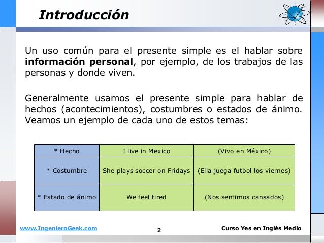 Este tiempo verbal que en inglés se llama simple present es tal vez el primero que estudia quien tiene un acercamiento al idioma y tiene una variedad de usosse debe tener en cuenta que el inglés tiene otra forma de expresar los eventos presentes pero durativos.