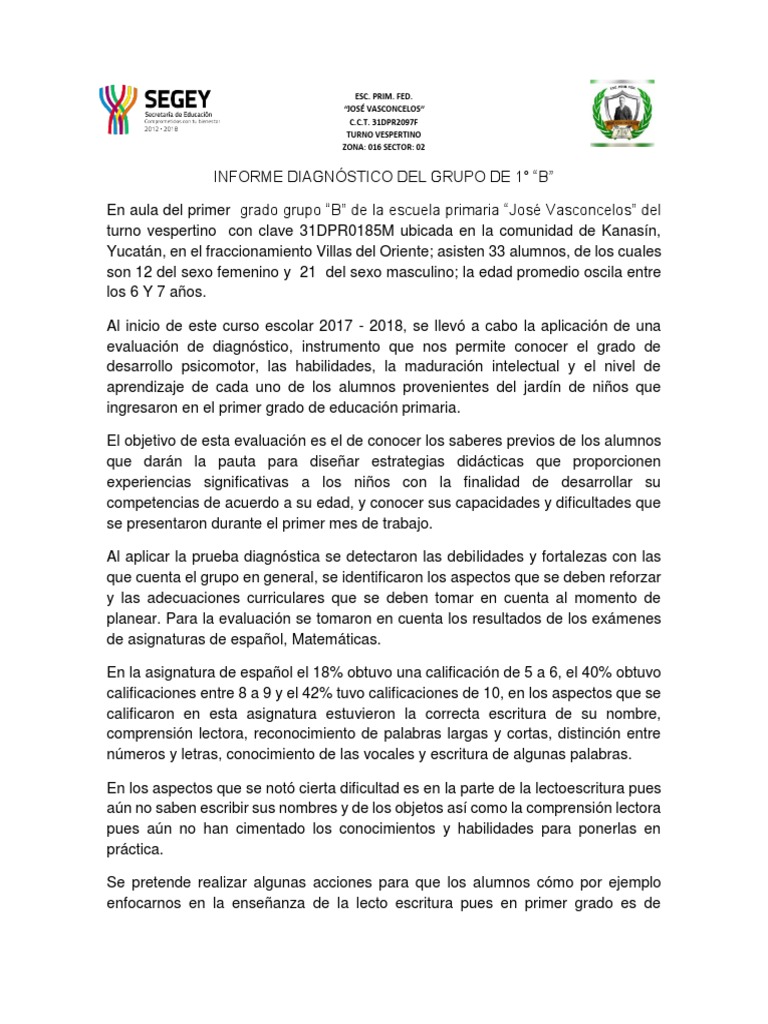 Informe Diagnostico Primer Grado Informes Gabriela Gabriela