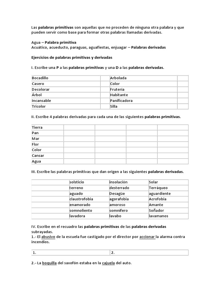 Ejercicios Palabras Primitivas Y Derivadas