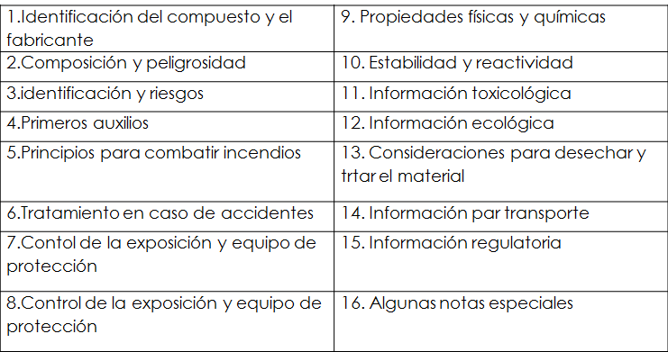 Se resumen los elementos de las fichas de seguridad detallando la información a incluir en cada ítem.
