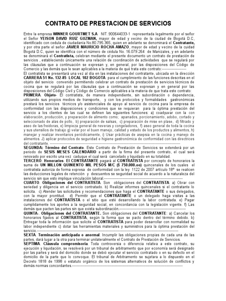 Contrato De Prestacion De Servicios Cocinero Gobierno Politica