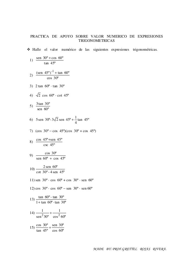 Practica De Apoyo Sobre Valor Numerico De Expresiones
