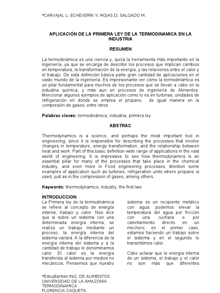 Aplicacion De La Primera Ley De La Termodinamica A La Industria
