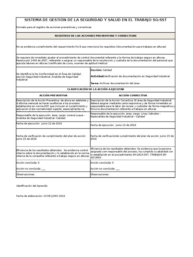 Ejemplo De Formato De Registro De Acciones Preventivas Y