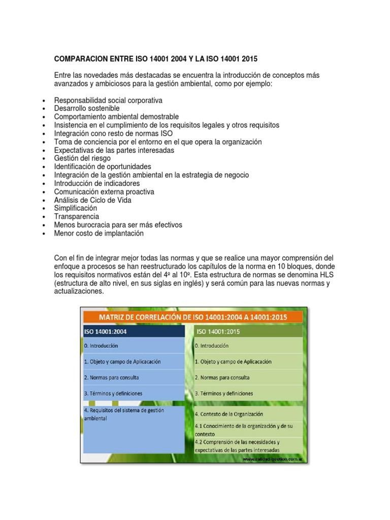 Matriz De Correlacion De Iso 14001 2004 A Iso 14001 2015 Calidad