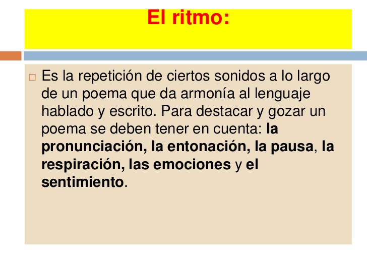 El ritmo en la poesía también es llamado armonía o musicalidad y consiste en la distribución regular de las sílabas acentuadas en un verso para que coincidan con las del verso siguiente o bien con el verso con el que rima lo que le dará musicalidad a la estrofa.