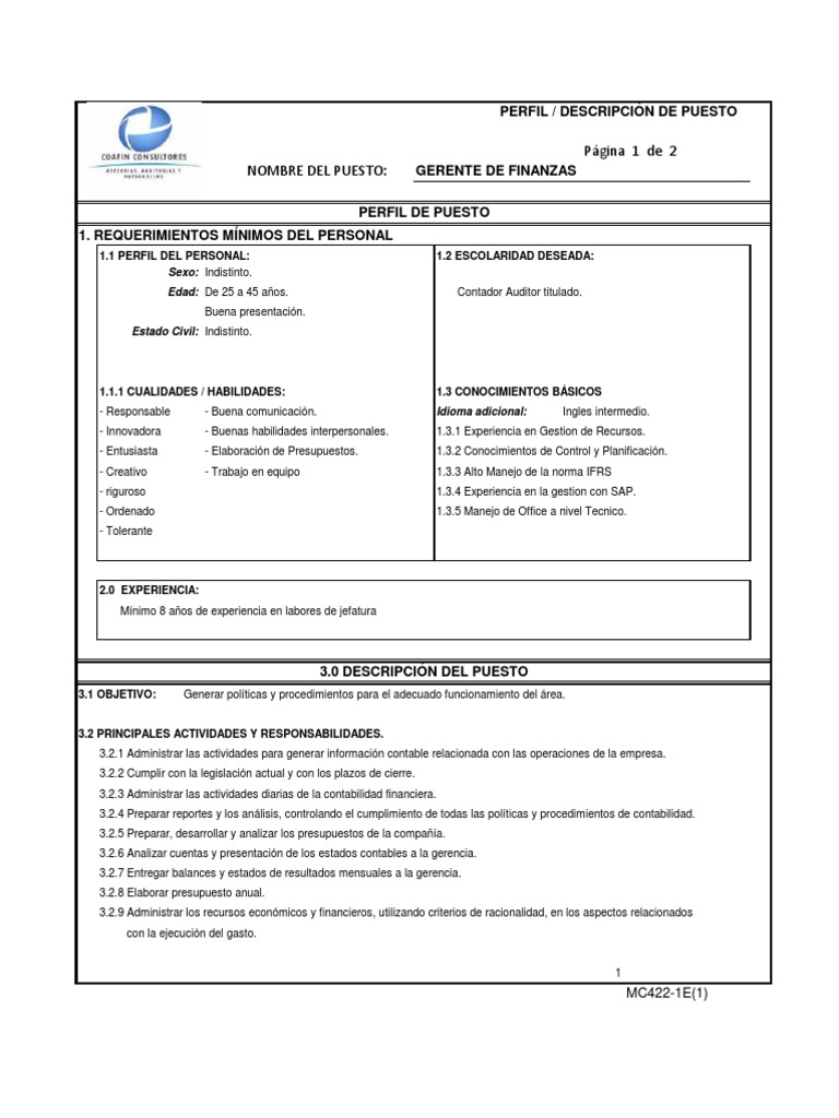 Modelo Perfil Puesto De Trabajo Contabilidad Contralor