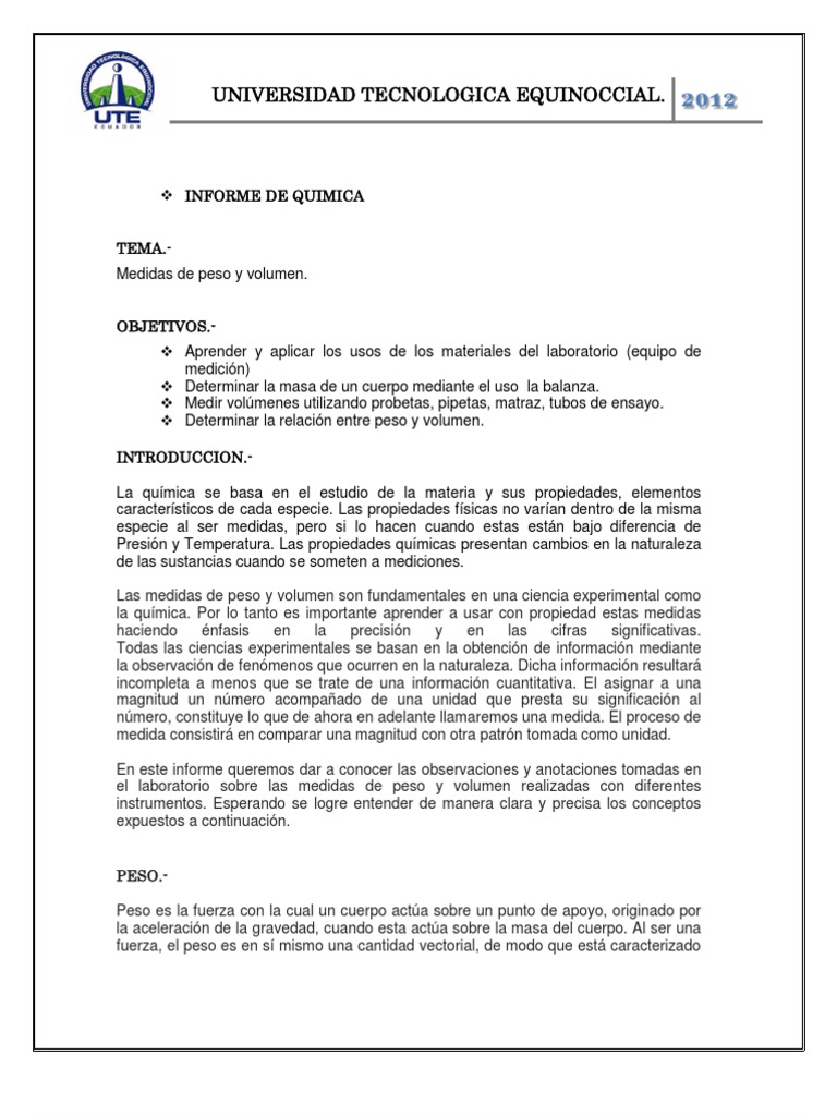 Informe Peso Y Volumen Quimica Peso Del Cuerpo Humano Volumen