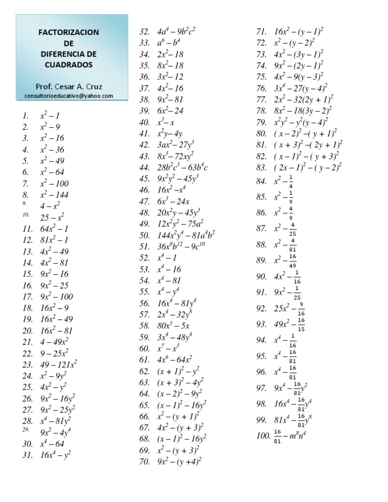 100 Ejercicios De Factorizacion De Diferencia De Cuadrados