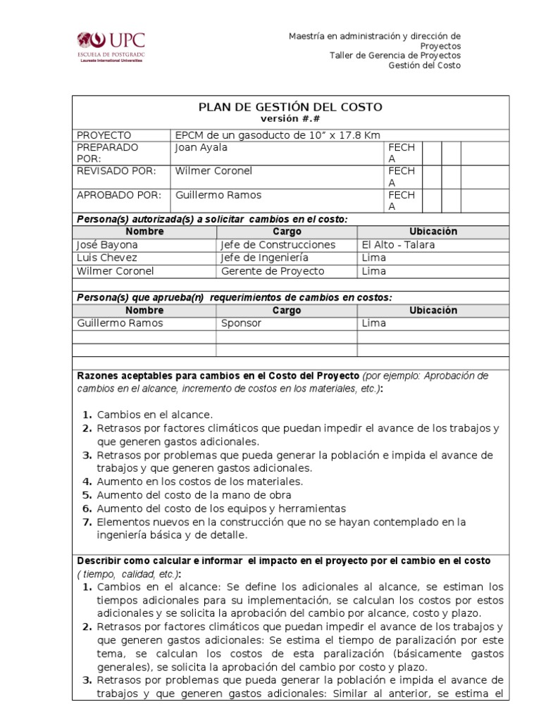 1 Plan De Gestion De Costos Ingenieria Tecnologia Free 30