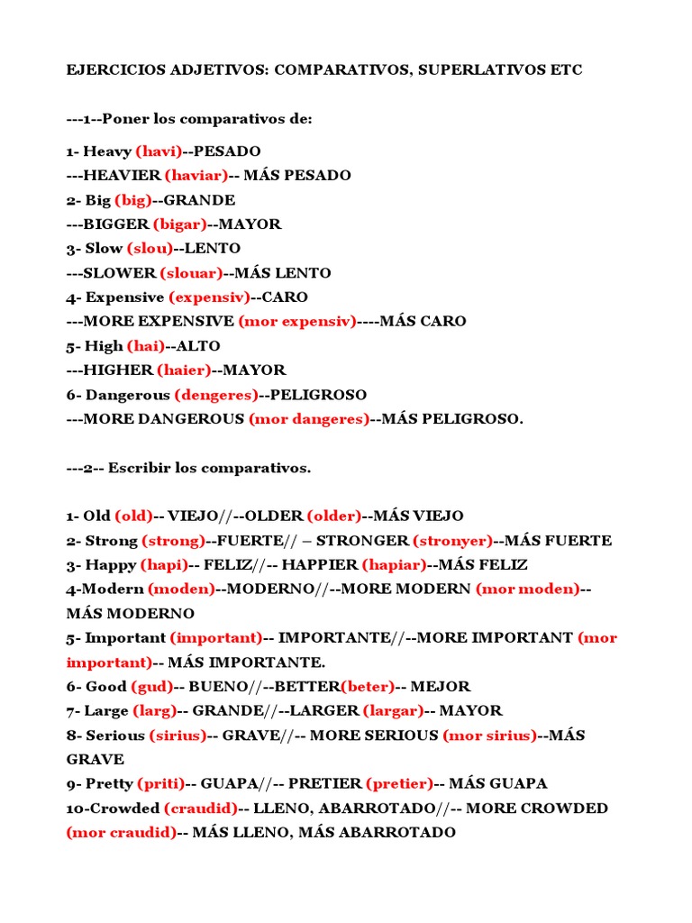 Ejercicios De Adjetivos Forma Comparativa Superlativo Etc