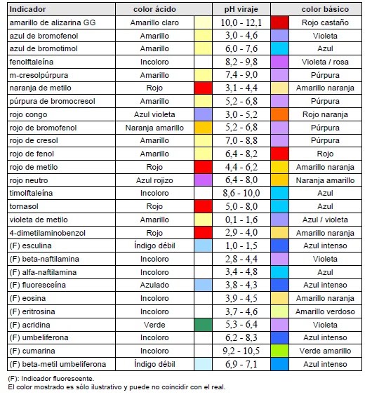 En la tabla se muestran algunos indicadores ácido base o de ph con sus intervalos de viraje intervalos de ph en los que cambian de color y sus distintos colores según se encuentren en medio ácido o básico.