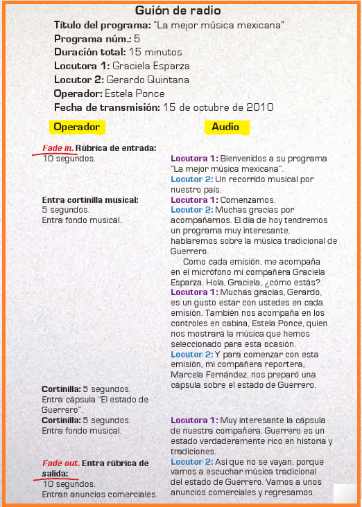 Ejemplo de guión radiofónico indicaciones técnicas audio entra música 3 segundos.