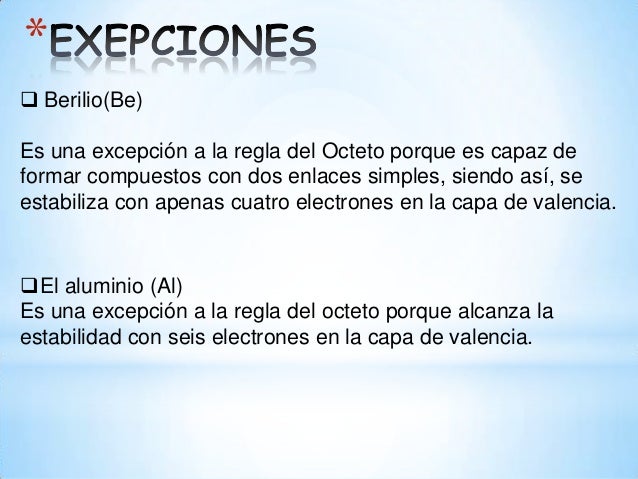 Si bien la regla del octeto es muy útil para la determinación de la estructura de lewis de algunas moléculas sencillas en especial aquellas que están formadas por átomos no metálicos del segundo período por ejemplo oxígeno carbono nitrógeno lo cierto es que existen excepciones a la misma.