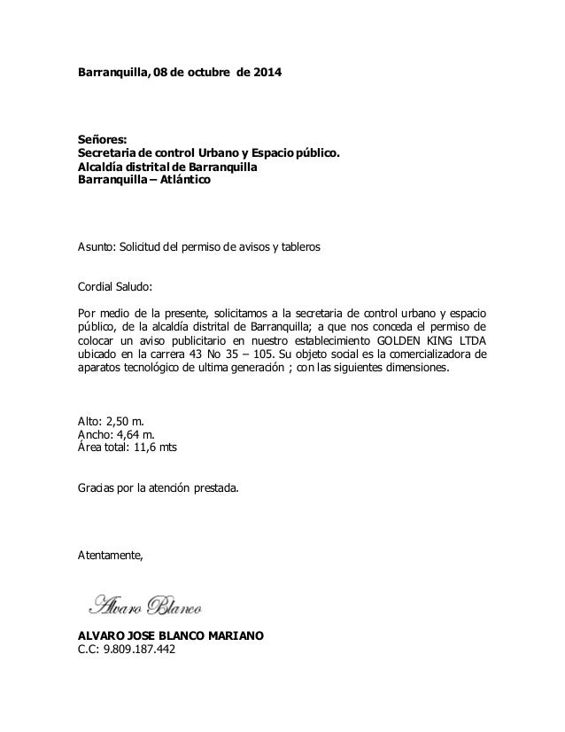 Carta De Solicitud De Permiso De Avisos Y Tableros