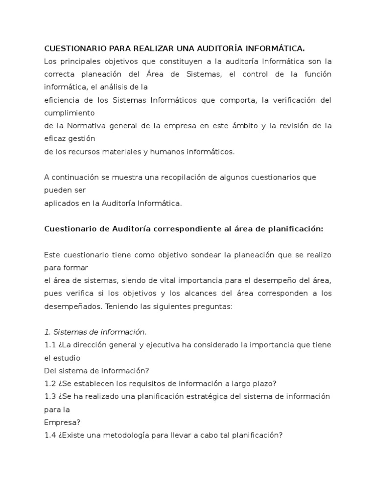 Estas son recomendaciones sobre Ejemplo De Cuestionario De Auditoria Informatica.