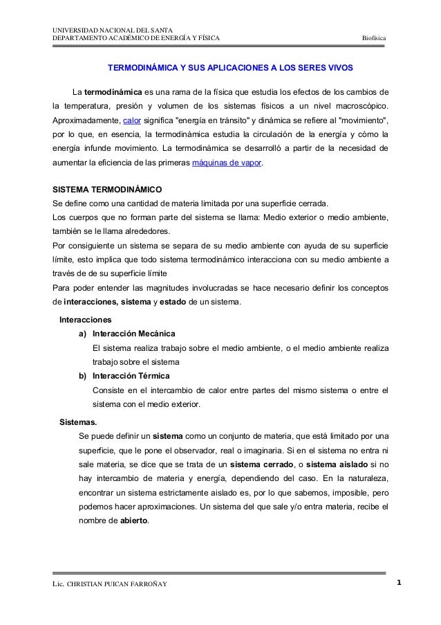 Termodinamica Y Sus Aplicaciones A Los Seres Vivos