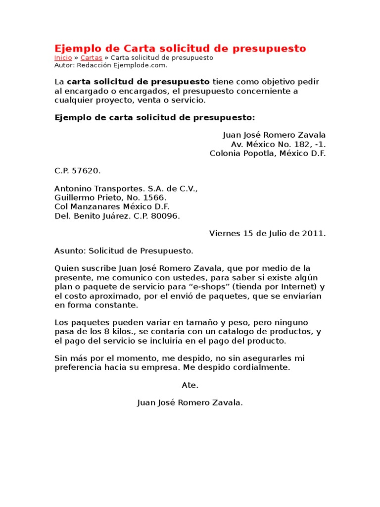 Ejemplo De Carta Solicitud De Presupuesto Presupuesto