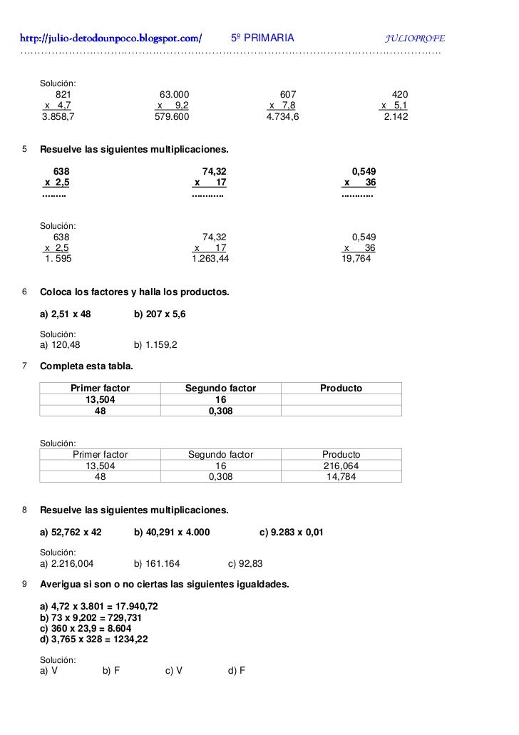 Multiplicacion Con Decimales Para Cuarto De Primaria